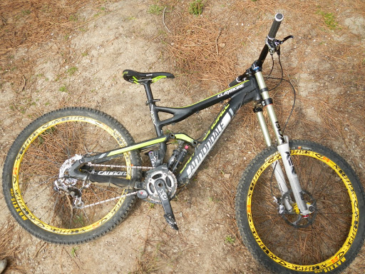 Gracias a un apunte de un forero en el foroMTB, he mirado mas detenidamente la bici y efectivamente no es una de DH sino una enduro LT (Long Travel). Es una Claymore montada para descenso, con horquilla doble pletina Boxxer, ruedas deemax e incluso cassette de descenso. Desde aquí gracias por el apunte Evokronik.
