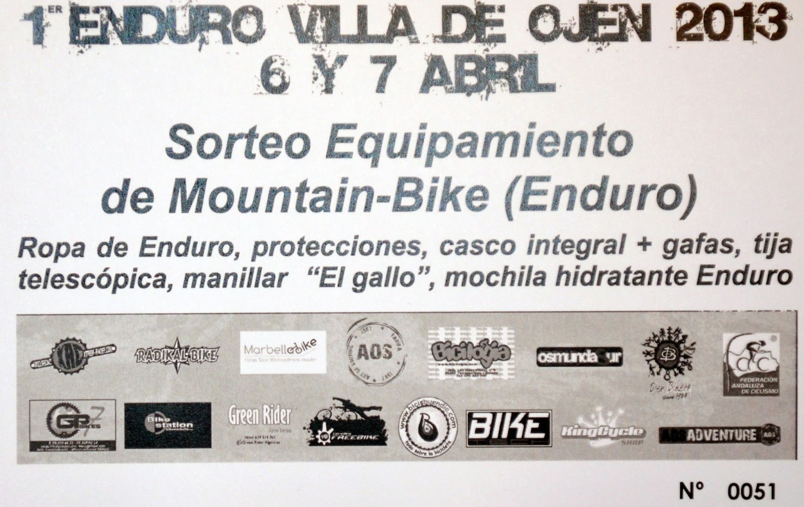 Ya tenemos papeletas para el sorteo que se hará en la carrera BigRide Ojén 2013! Compra ya! Por 2 euritos de nada podrás tener al alcance de la mano una equipación de enduro completa, tija telescópica, casco, manillar, gafas, maillot, pantalon corto, protecciones y más!