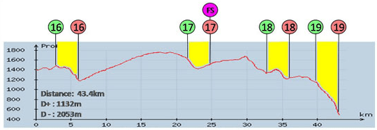 Hoy ha transcurrido la 4ta etapa de la Trans Provence. La distancia a recorrer eran 43km, 1132m de desnivel positivo y 2053m de bajada, con 4 tramos cronometrados. En la imagen los tramos cronometrados marcados en amarillo.