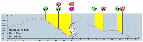 Quinto y penúltimo día de la Trans-Provence! Hoy ha sido la etapa considerada la mas dura y la mas larga, 47km, con un desnivel de subida de 1430m y 3358 de bajada, alucinante, todo repartido en 4 tramos cronometrados, con un enlace en bus en medio de la etapa, como se puede ver en el perfil a continuación.