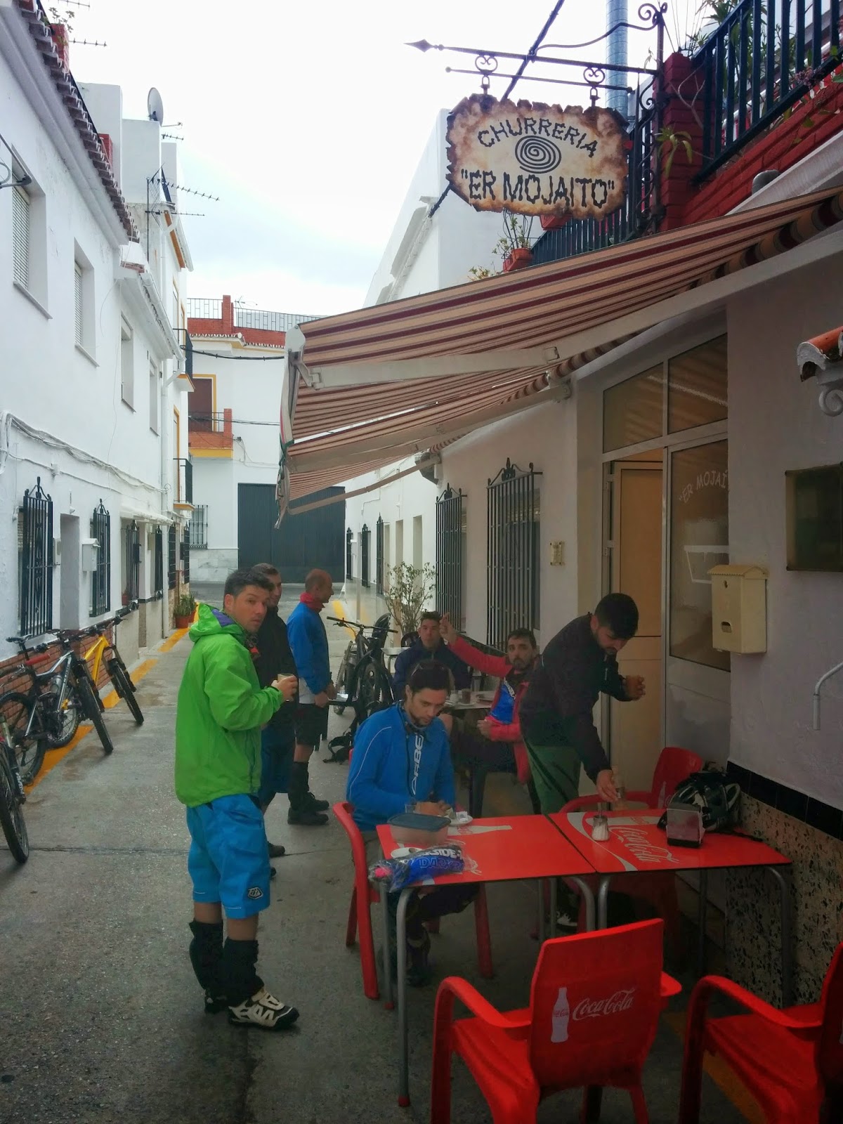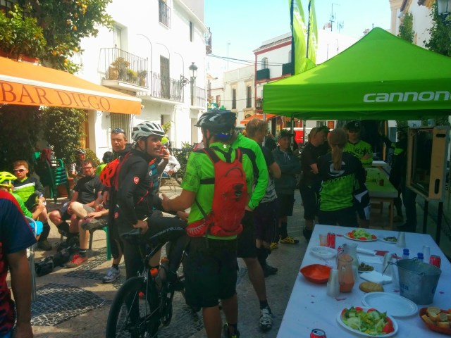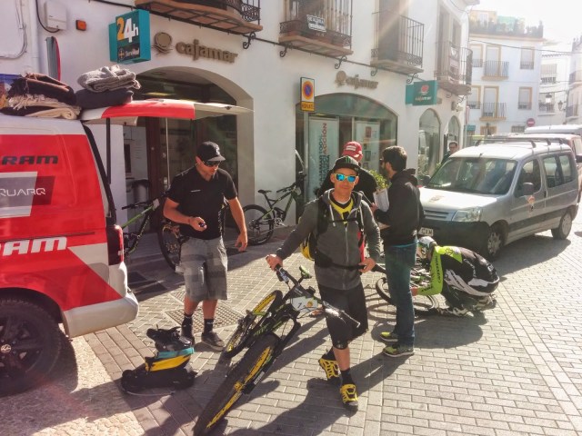 Amanece el jueves, hoy hay movida con Cannondale. Es el lanzamiento mundial de la nueva Jenkyll y la nueva horquilla Lefty SuperMax, de la serie overmountain. Bajamos a desayunar a “Er Mojaito” donde sino, el mejor sitio para desayunar en Ojén. El Zurdo queda pasmado con el “churro moja’o”, como a todos, le sorprende la combinación del churro con el agua con sal. Nos ponemos hasta arriba y subimos a la plaza del pueblo. Ambientazo, periodistas por todas partes, se oye hablar inglés, japonés, español latino, alemán y más. Representantes de todas las principales revistas de MTB del mundo, tanto online como papel, PinkBike, MTB UK, Dirt, SoloBici y un largo etc. Y claro, los más solicitados de todos, los corredores oficiales del Team Overmountain de Cannondale, casi al completo. Jerome Clementz, Ben Cruz, Marcos Osborne, Pauline y alguno más que se me queda. Para el test de las bicis les han preparado una “mini big ride”, subirán directo a lo que será el tramo 2 de la carrera, luego harán el tramo 4 y el 3. Para ellos están numeradas como 1, y 3. Este punto importante señalarlo, ya que el viernes aún quedaban algunas de las señalizaciones y riders que ya estaban por la zona para entrenar se confundieron y pensaron que este sería el orden de carrera. Claro, se preguntaban entonces en que momento se subiría a las temidas “antenas”.