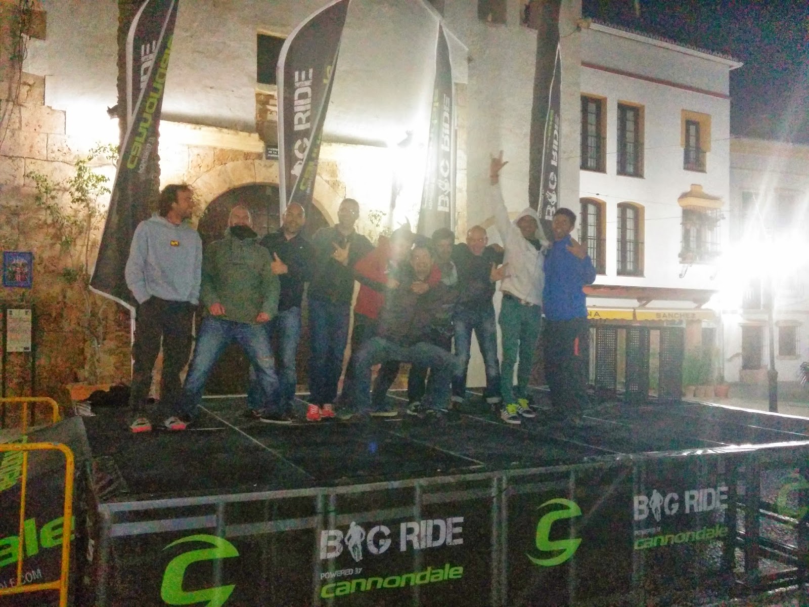 Llegamos arriba y los comentarios son todos similares, el terreno esta perfecto, la bajada es una pasada de divertida, ya no hay barro y las cubiertas se agarran los justo. Nos tiramos, nos repartimos los tramos, yo me encargo de verificar el tramo 1 y el 2. Esta casi todo bien, un par de cintas que el fuerte viento ha roto o desplazado pero nada grave, añado algún otroz aquí y allá, pongo cinta donde falta y tiro para alante. Voy cruzandome con riders, los comentarios me confirman que todos están encantados con el trazado, todo un éxito. A media tarde nos reencontramos en el pueblo, comemos, intercambiamos unas palabras con los amigos y conocidos que van apareciendo, muy buen rollo y ambiente. Aparecen los corredores de Cannondale, Jerome, Ben, Marcos, Aidan Bishop, Pauline. Comienza la ronda de fotos, preguntas e intercambios con ellos. A Jerome, como campeón del mundo y cara más conocida no lo dejan ni comer, me acerco a Ben Cruz que veo mucho más relajado, conversamos unos minutos, me comenta que les ha encantado el trazado, sobre todo la primera bajada por supuesto. Elogia el trabajo de todos los que han colaborado y el ambiente ciclista del pueblo. No puedo evitar sentirme un tanto orgulloso, todos hemos colaborado para esto y parece estar dando el resultado esperado. Terminamos de comer, cafelito y pa’rriba de nuevo. Si, subimos las antenas con remonte, pero luego nos toca pedalear por todos los enlaces, al final del día miro el Endomondo y desde el jueves cada día me he chupado el equivalente al recorrido completo de la carrera con desnivel similar, nada bueno para el domingo, pero no pasa nada. Llega la noche, presentación la serie de Jerome “12 meses, 12 historias” en la plaza, no llueve así que se puede ver al aire libre. Al finalizar tenemos el concurso de bunny hop, con menos participantes de lo esperado pues la mayor parte de los corredores ya se han ido a dormir para estar frescos mañana. Así y todo hay un buen ambiente, tenemos a 7 contendientes, cada cual intentando ser el ganador de una equipación endurera y un casco integral. Un puntazo del rider Juanillo “el travieso” de los Aloha OJén Enduro Team, que anima el cotarro con su desenfado y ganas de pasarselo bien. Se pega un porrazo en uno de los saltos, por suerte sin consecuencias de ningún tipo. Sigue la fiesta y al final el ganador un rider del team vecino nuestros y que también han colaborado en la organización y acondicionamiento del circuito, el equipo GreenRiders de Algeciras. Y a dormir que ya es tarde.