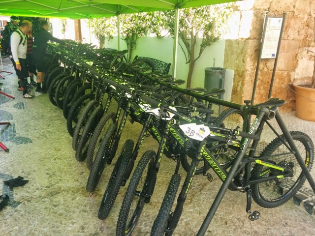 Llegamos abajo, comento con Zurdo el curro que se han pegado, esta bajada estaba bastante sucia. Pero aún nos queda la guinda del día, la bajada del tramo 3, la llamada “Charca de Las Viñas”, con muuuucha piedra. Para mí, la mejor y más divertida, un terreno muy parecido por el que suelo rodar en Mallorca. Cuando llegamos al replano que hay antes de comenzar nos juntamos nuevamente con la prensa. Esta vez están casi todos, están probando una bici eléctrica, vaya aparato, es una gran ayuda en las subidas. Pasamos un rato admirando las bicis y cuando ya todos han partido lo mismo hacemos.
