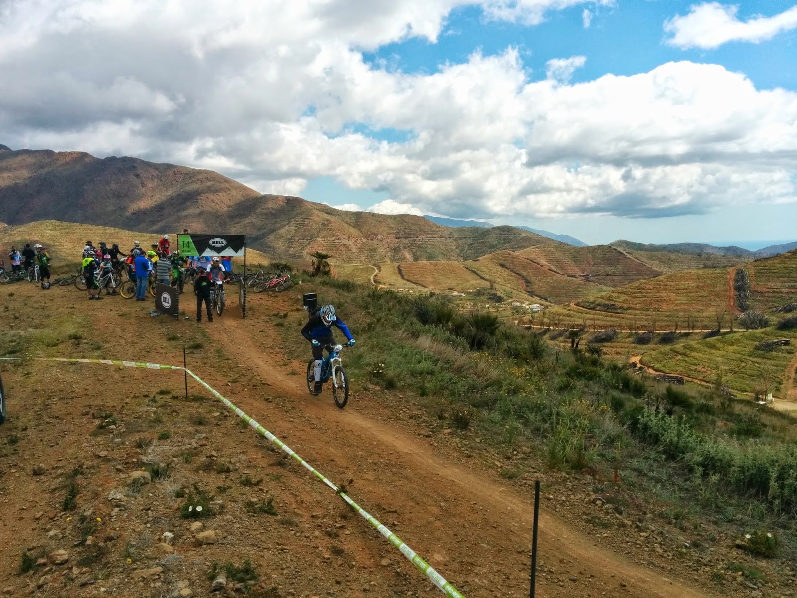 Tramo 1, el terreno ya un pelín seco pero nada que ver con los días anteriores, poco polvo y muy buen agarre en la parte alta del recorrido. Comienza la primera bajada rapidísima, curva, curva, escalón, derrape, otro escalón, Poba me da alcance poco antes de la torre eléctrica, no espero a que me pida paso, me quito antes para dejarle hacer su carrera sin contratiempos, yo sé que si logro bajar del puesto 200 es toda una victoria. Seguimos para abajo, por momentos en la zona de pedaleo le doy alcance pero en cuanto pica pa’bajo lo pierdo de vista, adelantamos a una de las chicas, viene el cortafuegos, mamita como te quiero, quien coño me habrá mandado a meterme en esto, piedra, escalón, curva, otro escalón… pasooo!! Me ha pillado el otro corredor, es el 134 de los BikerSupport, ya que el 133 no se ha presentado, Derek, de nuestro team, que tuvo una caída bastante aparatosa el finde anterior. Coño, que rápido baja el 134, a ver si le puedo seguir y recuperar tiempo, zona rápida, curva a derechas y….PATAPAM!!! Caída. Nada grave pero en lo que me recupero y me lanzo nuevamente ya lo he perdido de vista. Paso el repecho, lo subo bien y ya casa arriba me pilla el 135 pero se ve que ha penaliado en la subida y le vuelvo a adelantar. Ya solo queda la parte final muy chula, curva, escalón, otra curva, saltito pequeño, escalón, piedras por el fondo del torrente y listoooo! Acabado el primer tramo sin daños aparentes. A por el 2do.