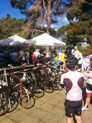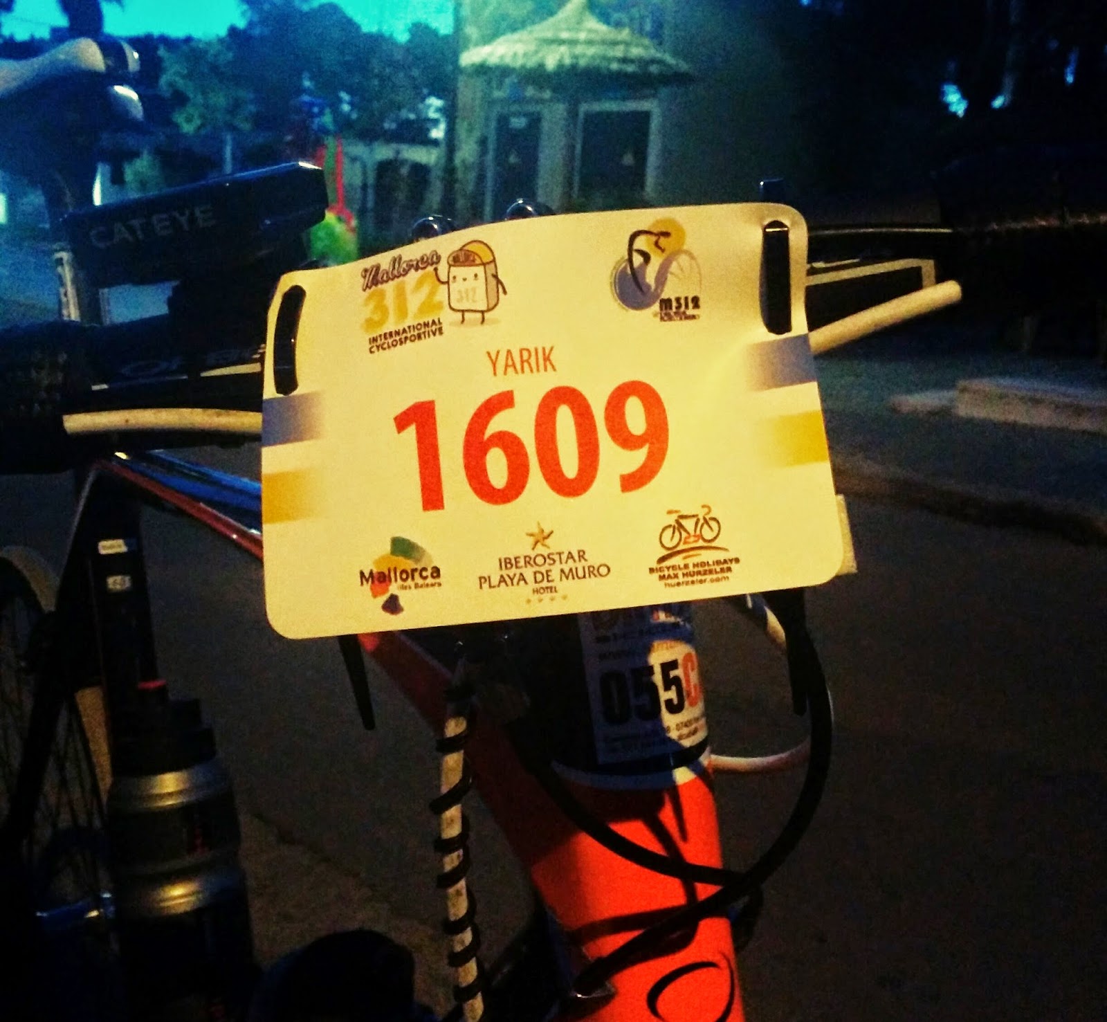 PiPiPiPiPiPiiii!!! Suena el despertador, sábado 26, día del evento. Ayer pasé a última hora de la tarde a recoger la bolsa con dorsal, chip, maillo conmemorativo y demás. De pie a las 5am, en media hora estoy listo, bici en el coche, un último repaso para no dejarme nada y salgo para Alcudia. Llego aún de noche, poco más de las 6am, mucho ambiente, ya se oye a lo lejos el audio y música del arco de salida/meta. Montón de ciclistas, muchos vienen rodando desde los hoteles cercanos, otros, residentes de la isla, como yo, vienen en coche. Me cambio, último chequeo, frenos, neumáticos, dorsal, móvil, herramientas, todo parece estar en orden.