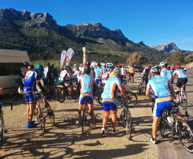 Veo pasar el cartel de comienzo del coll de Femenia, primera subidota del día. A partir de aquí mi plan es sencillo, reservar, reservar y reservar. No he hecho nada parecido jamás, no sé como responderá el cuerpo a tantas horas seguidas de pedaleo sobre la bici con tanto desnivel acumulado al final del día. Así que me planteo subir por debajo del ritmo que pueda permitirme. Ya se nota que estoy se pone serio, se va estirando el pelotón, poco a poco van subiendo piñones y no hay tanta cháchara. PimPamPimPam…vaya, esto yo lo conozco, estamos llegando al cruce que va hacia Binifaldo, no ha sido tan largo como parecía, bueno sí, pero no ha sido tan duro como pensaba. Llaneo hasta Lluc y ahora toca la subida del coll de Sa Batalla, esta y la siguiente hasta el coll des Puig Major las conozco bien, las he hecho un sinfín de veces con la bici de montaña. Que diferencia con la “flaca”, esto te deja subir a buen ritmo, si estas bien claro. Mas o menos subo con los mismos que subí el coll de Femenia, algunos adelantan otros bajan el ritmo. Me siento bien, nos acercamos al túnel y veo la señal del 1er avituallamiento a 1km, justo pasando el túnel. Paro en el avituallamiento, no pienso saltarme ninguno de los 3 que tendré, no quiero arriesgarme a calambres ni nada parecido por falta de hidratación o comida. Llevo conmigo varios geles (potingues les llamo) que iré dosificando. Me tomo sin pestañear un par de aquarius, relleno ambos bidones que tenía más o menos por la mitad.