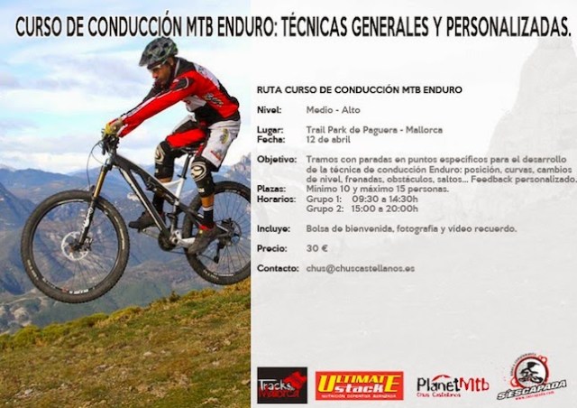 Si estas por Mallorca el finde del 12 de abril y quieres mejorar tu técnica endurera y pasarte un día fenomenal, no dejes de apuntarte al curso que impartira el conocido rider Chus Castellanos. Habrá 2 niveles, básico y avanzado.