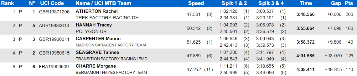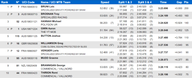 Todo el mundo esperaba una vez más la batalla entre Aaron Gwin Loic Bruni, sin descartar a los corredores locales y en especial a Troy Brosnan. Casi desde el inicio de la carrera se podía ver donde se ganaría o perdería la carrera, el último tercio del recorrido era casi plano, donde la resistencia física, un sprint largo y duro serían los que decidirían los puestos. Una bajada impresionante del local Joshua Button le posicionó en el podium hasta lograr entrar en el Top5, su mejor resultado en su carrera deportiva de momento. Fue impresionante ver el sprint bestial del colombiano Marcelo Gutierrez del Giant Factory Off-Road, pero ni así pudo recuperar el tiempo perdido en los 2 primeros tercios de carrea. Aaron Gwin, también reconocido por su fortaleza en el pedaleo, no pudo batir los mejores tiempos y quedó fuera del podio. En su bajada Loic Bruni fue destrozando metódicamente cada segmento, sacando varias décimas en cada uno. Al final, 1er puesto con 0.493 de ventaja sobre Troy Brosnan, que no son compañeros de equipo pero si comparten patrocinio de Specialized. Tercero quedó el australiano Michael “Sick” Hanna a casi 1seg de Loic y medio de Troy.
