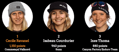 En la categoría femenina la francesa Cecile Ravanel del Commencal Vallnord encabeza la lista con 1150pts. En 2do la joven Isabeu Courdurier del Sunn con 960pts y en tercer puesto Ines Thoma del Canyon Factory Enduro Team con 880pts. Curioso que precisamente Cecile Ravanel fue la tercera en el podio en La Thuile en 2014, con Tracey Moseley en lo más alto y Anne Charoline Chausson segunda, ambas 2 alejadas de la competición, una por decición propia, la otra por temas de salud de los cuales ya parece estar recuperandose.