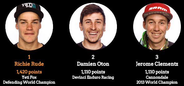 En categoría masculina el estadounidense de Yeti/Fox Richie Rude marcha a la cabeza muy fuerte con 1420 pts. Le siguen el fránces Damien Oton del Devinci EnduroRacing (te suena el nombre? 2do lugar en la MegaAvalanche este finde pasado) con 1110pts y empatado en 3er lugar el también francés Jerome Clementz del Cannondale.