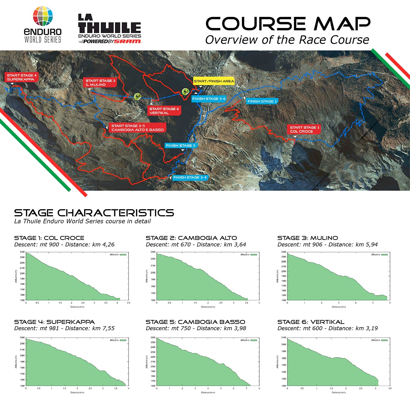 En La Thuile los corredores tendrán 6 tramos cronometrados, 3 sábado y 3 el domingo. Habrá una combinación de enlaces con pedaleo y remontes mecánicos. En total tendrán un desnivel positivo de 1204m y un desnivel negativo de 4807m, no está mal no? El tramo cronometrado más largo será el 4to tramo, el primero del domingo, con 7.55km de longitud, “SuperKappa” como le conocen localmente es el sendero más representativo de la zona. Sin embargo, el tramo que más desvnivel negativo tendrá será el tramo 3, el tercero y último del sábado, con 906m en 5.94km. Pero en proporción, el tramo con más desnivel será el primero de todos, donde los riders bajarán 900m en 4.26km. El tramo 6, “Vertikal”, será el más técnico de todos con varias zonas pedregosas con mucho desnivel que exigirán el máximo de los corredores que ya llevarán unos cuantos km en las piernas.