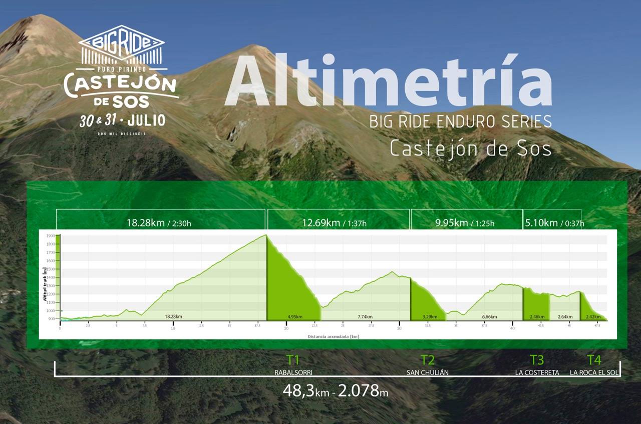 Castejón de Sos “Puro Pirineo” repite sede, después de una estupenda carrera el año pasado donde todos los ridres disfrutaron un montonazo. La organización se lo ha currado para ofrecer lo mejor de lo mejor a los corredores y que todos se lleven una buenísima experiencia. Serán casi 50km con 2078m de desnivel acumulado repartidos en 4 tramos cronometrados. Por la altimetría podemos ver fácilmente que el primer enlace servirá para calentar las piernas a los corredores, 18km para subir desde 900m de altura hasta nada más y nada menos de 1900m.