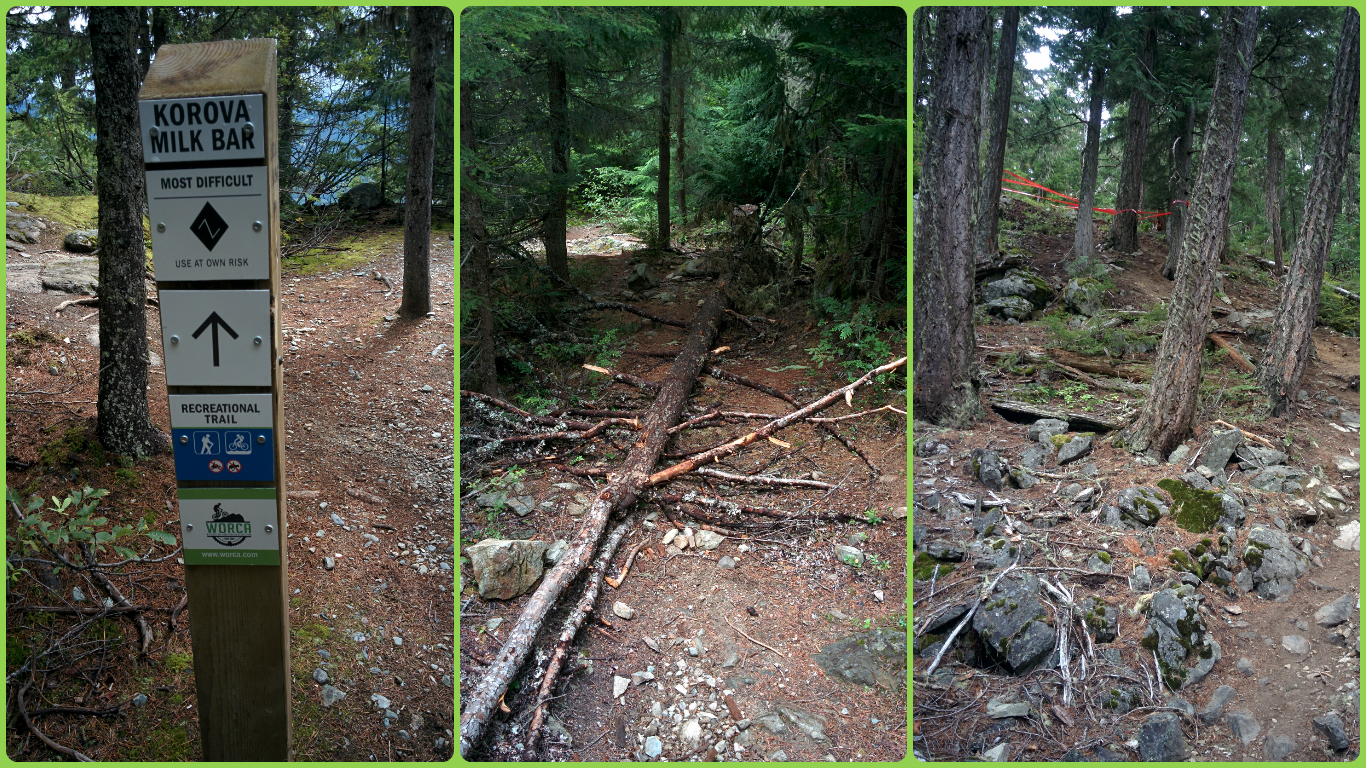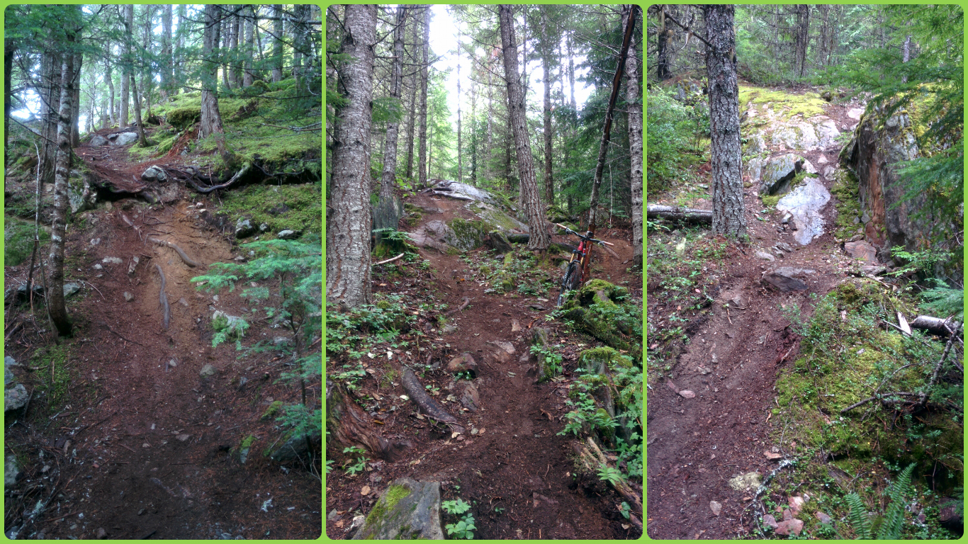 Después entrarán a Short Bus, un sendero marcado como azul que inicialmente sería algo muy sencillo y lo es en su gran parte. Pero hay 2 puntos que tienen una dificultad interesante. El primero es casi una pared de unos 20m con mucha tierra y poco agarre. Estaba encintado para evitar que la gente que estaba mirando el tramo lo hiciera. Bajarlo andando ya es complicado por el tremendo desnivel. Una vez pasado este tramo un par de cientos de metros despues está el otro punto complicadillo. 2 rocas grandes seguidas que cortan el flow bastante. Creo que en carrera lo que harán es volar la primera piedra directamente. Yo al final hice un zigzag entre ambas piedras, siguiendo la parte de tierra.