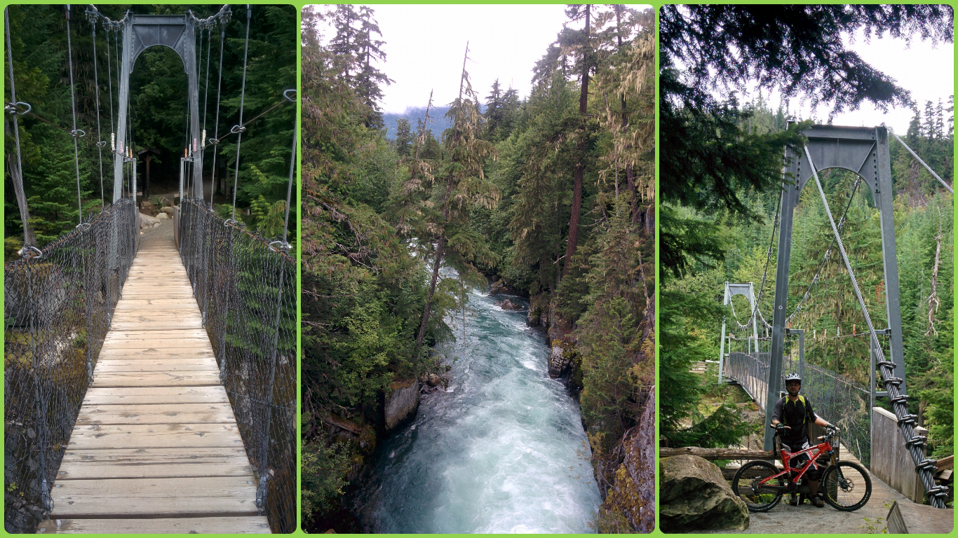Una vez abajo paré en un pequeño café a calentarme con un café y planear que hacer. Mirando TrailForks vi que el tramo 4, con los senderos Heavy Flow y Tunnel Vision no estaba muy lejos, había que remontar unos 3km por una pista de acceso. Para evitar la pista me hice 2 senderos, azules, Riverside y Highline. El 1ro, Riverside, va ganando altura poco a poco, paralelo a un río, es muy pero que muy bonito y entretenido. En un punto determinado cruzas un puente suspendido sobre el río muy chulo. Tras el puente hay varias opciones y tomé la que continuaba hacia Highline.
