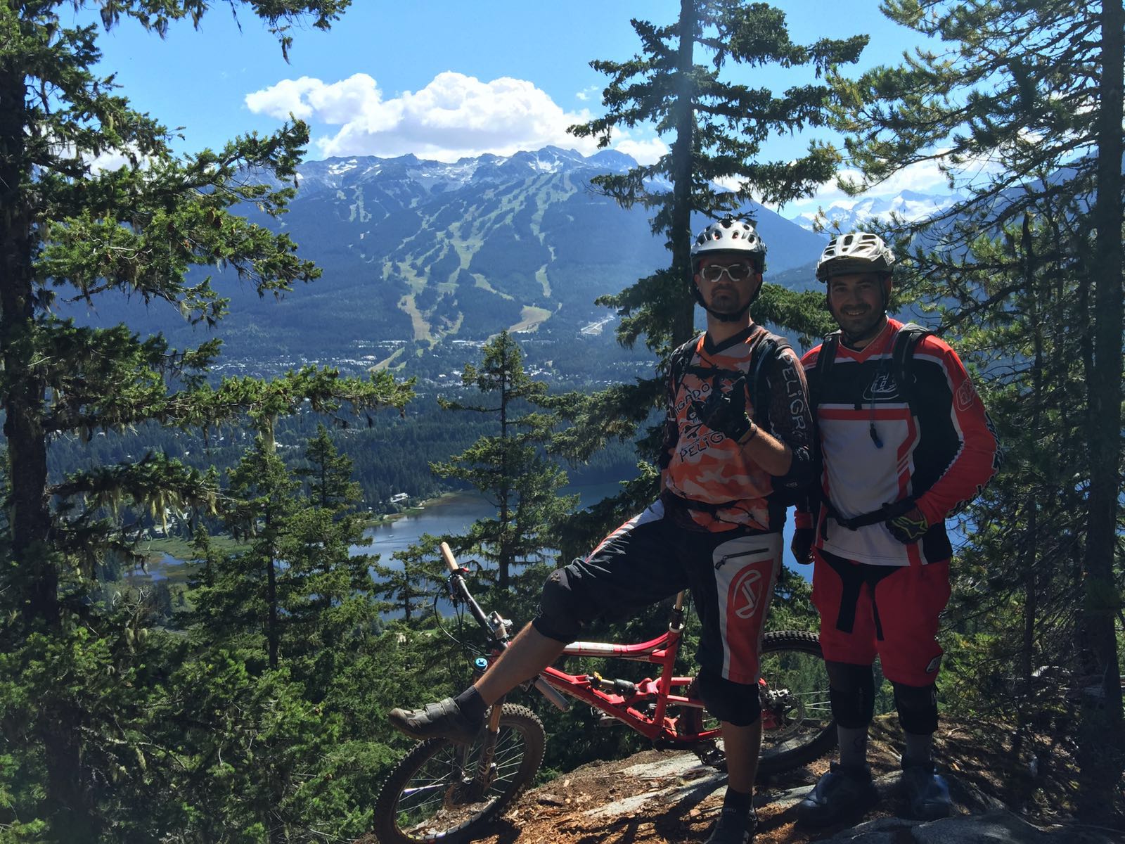| caras de felicidad en el paraíso, al fondo Alta Lake y Whistler bikepark |
