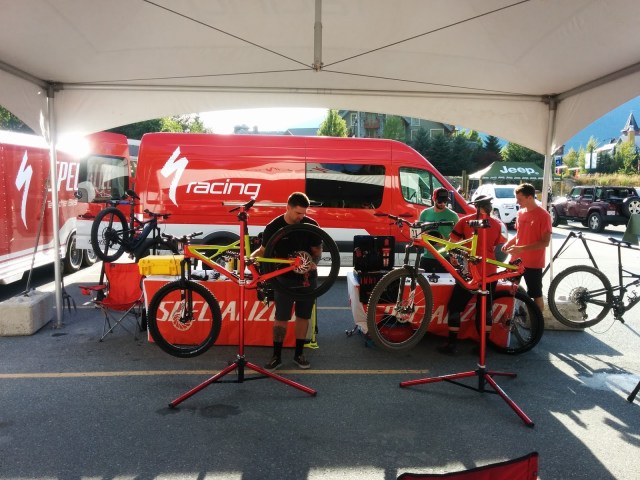 Mañana hay más entrenamientos de la EWS y algunos eventos del Crankworx que ya arranca. Yo pienso darme un palizón de ruta de enduro ya que hoy hemos descansado bastante y el domingo pienso dedicarlo completo a seguir la carrera. Mientras, algunas fotos de los pitboxes de algunos equipos y bicis de los cracks, os dejo a ustedes adivinar los corredores por sus dorsales.