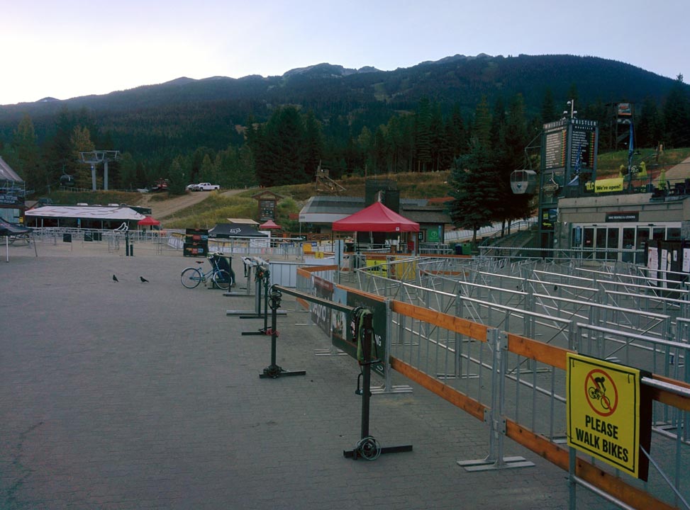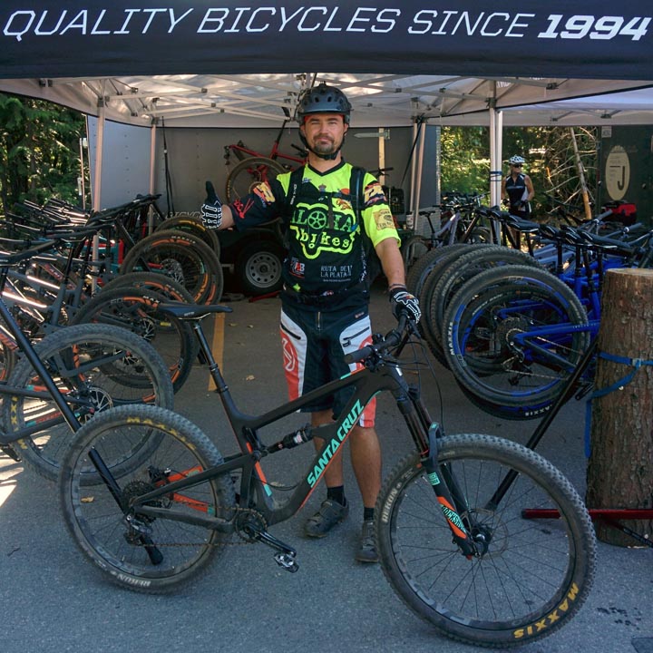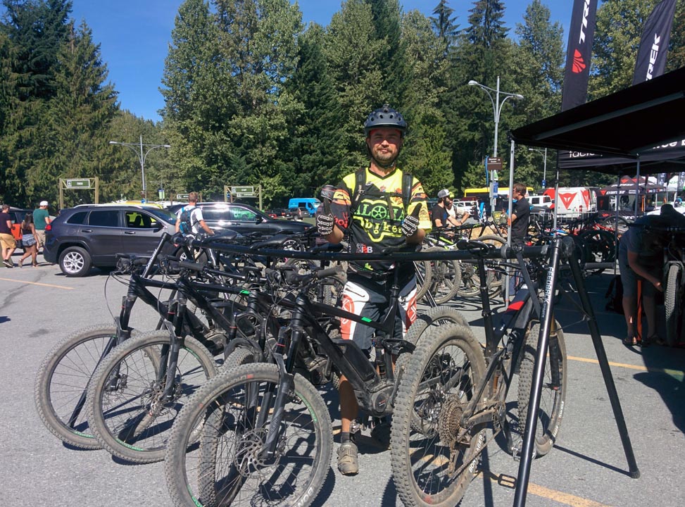 A primera hora de la mañana he tenido 3h de voluntariado en las oficinas de la organización del Crankworx, nada del otro mundo, cargar cosas de aquí para allá, orientar a otros voluntarios, etc. Pero por cada turno que haces de voluntariado te dan al final un ticket para tomar una birra gratis y un 20% de descuento en comida en un bar que está bastante cerca de casa, el Merlins. Y hoy he tenido suerte y me tocó una chica que le gustó como trabajé y me dio 5 tickets, que te parece. Esta claro que hoy hemos cerrado la noche en el Merlins. Cuando salí de allí a las 10 paré a desayunar rápido en un sitio cualquiera (10CAD un café con leche y un bocata mediano) y seguí hacia uno de los parkings del pueblo donde todas las marcas han montado sus carpas. Chus y Xicotet me había comentado de la posibilidad de pasarme por allí hoy y cogerme un par de bicis de demo o prueba que dejan las marcas por una o dos horas.
