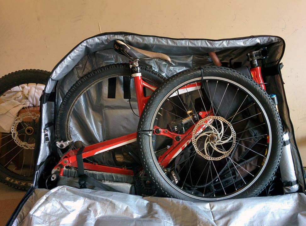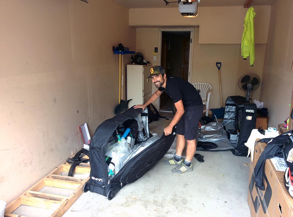 | el fotógrafo Kike Abelleira también se iba hoy, una hora antes que yo, aquí los dos recogiendo las bicis en nuestras bolsas EVOC |