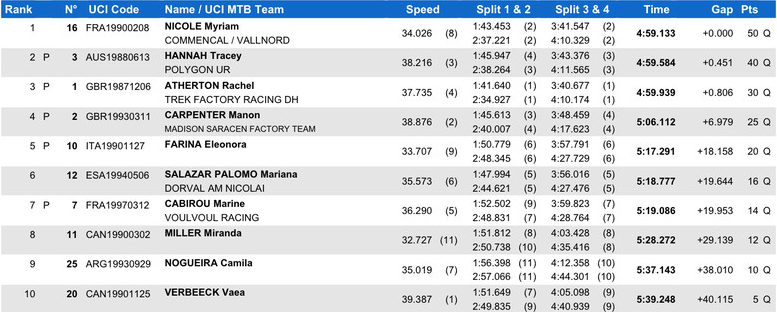 En féminas, a Myriam Nicole le han seguido Tracey Hannah a 0.451s y Rachel Atherton a 0.806s.