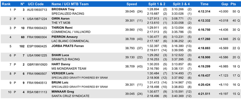 Vaya como esta el tema! Hoy ha sido la clasificación, Troy Brosnan, Myriam Nicole y Finn Illes se han llevado el 1er puesto. De los que interesan para la general, Aaron Gwin 2do, Danny Hart 7mo. Ojo a los 2 riders que se han metido 4 y 5, un francés del Commencal y un español, Ferran Jorba Prats. Este chaval de 20 años no lo está haciendo nada mal, actualmente marcha 2do en el campeonato de España de DH y el 131 en el la Copa del Mundo de DH. Veremos como lo hace este finde.