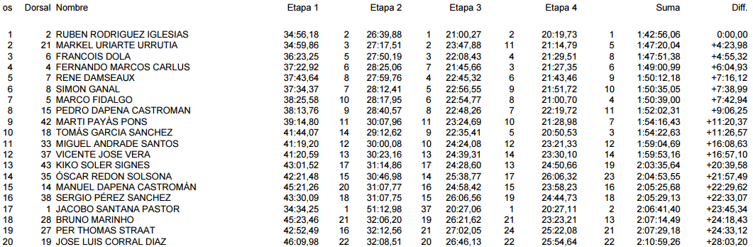 Al final de los 4 días los resultados han quedado de la siguiente manera, con Rubén Rodiguez, Markel Uriarte y Francois Dola en los 3 primeros lugares respectivamente. Los resultados al completo aquí.