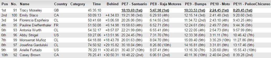 Finalizaron el día con la especial “Peñón-Chicureo” famosamente conocida de la primera edición de la Andes Pacífico y dio nombre al conocido “anti-grip”, con Iago Garay forjando su conocido slogan #doyouevendriftbro. Aquí los chilenos supieron jugar bien su baza de correr en casa, ganando Pedro Ferreira con 7:13.11, seguido por Jerome con 7:19.17 y tercero el joven Guga Ortiz con 7:21.36. En féminas Tracy cerró otro día ganando todas las especiales y salvo desastre ya virtual ganadora de la carrera, con 8:29 seguida a 10s por Casey Brown y tercera Emily Slaco a 51s.