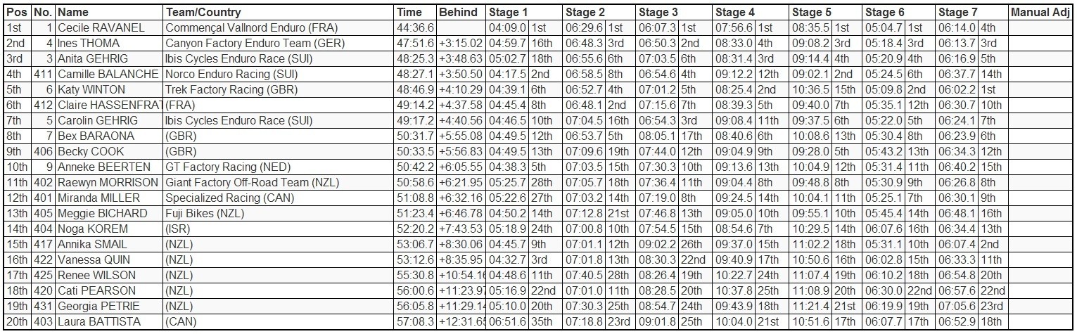 En chicas Cecile Ravanel ganó sin discusión, solo falló en el último tramo, donde Katy Winton del Trek Factory le arrebató el primer puesto. Isabeau Courdurier no pudo recuperarse de su caída y quedó fuera de los resultados. Ines Thomas del Canyon Factory Enduro Team 2da y tercera Anita Gehrig.