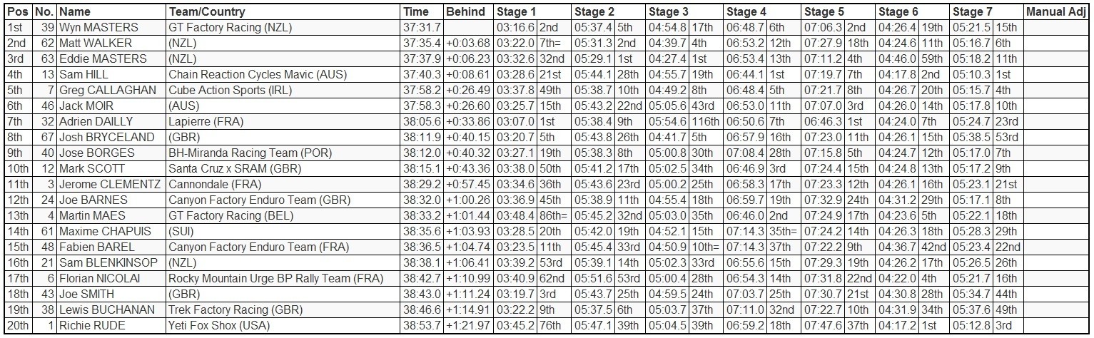 Durante el resto del día las cosas fueron nivelándose, pero no se evitó un podio copado por locales. Sam Hill ganó los tramos 4 y 7 (último) que le sirvió para quedar 4to de la general. Eddie Masters el 2do y 3er tramo logrando colarse de 3ro en el podio. Su hermano Win Masters aunque no logró ganar ningún tramo se mantuvo muy regular todo el día y se subió a lo más alto del podio. Richie logró ganar el 6to y al final quedó 20 scratch. El joven francés ADrien Dailly ganó el 1er tramo, quedando 7mo en la general. A los corredores de la copa del mundo de DH no se les dio nada mal, RatBoy quedó 8vo y Jack Moir 6to. El mítico rider francés Fabien Barel quedó nada más y nada menos que el 15, en un regreso inesperado a estas carreras, veremos si hace toda la temporada o solo un par de carreras. El español Iago Garay quedó en el 49, muy bien para las condiciones catastróficas del tiempo.