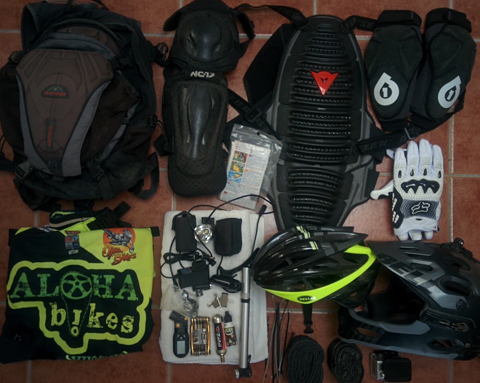 Según el reglamento una espaldera (o mochila certificada con protección) y protecciones largas de piernas son obligatorias. Casco puede ser “full face” o abierto. Es obligatorio llevar también silbato y manta térmica. Pero en carrera en ningún momento me verificaron ni vi que verificaran a nadie del cumplimiento de estas normas. Vi muchos con rodilleras normales y corrientes y con mochilas de risa de las que solo les caben 1L de agua y maillot normal. Las luces está de más decir que eran obligatorias, Las 2 primeras horas de carrera vas completamente de noche, incluyendo más de la mitad de la 1ra bajada. Como se ve en la foto, además llevé 2 cámaras de repuesto (de DH) por si el tubeless me reventaba, cubierta rajada o algo así. Multiherramientas, bombona de CO2, bomba de hinchar, medidor de presión, lubricante de cera, varias bridas en diferentes tamaños y alguna cosa más que seguro se me queda.