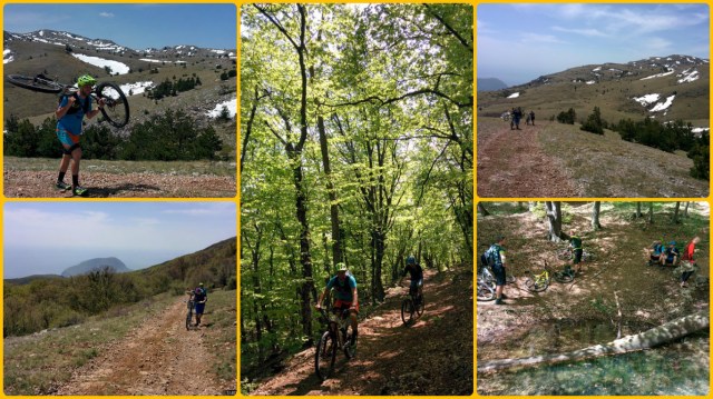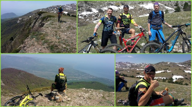 Tardamos 2h justas en llegar a lo más alto, con varias paradas para ir admirando el paisaje ya que lo merecía. En esta zona aún queda nieve de la nevada de la semana pasada, que nos pilló de lleno el 2do día que salimos a rodar. Una vez arriba nos tomamos un merecido descanso, nos comemos el bocata pertinente mientras admiramos las vistas (ver foto que encabeza la entrada) y nos vamos preparando para una bajada de 12km continuos en la que bajaremos los 1400m completos en los que nos encontramos. Se dice rápido, pero 12km son muchos kilómetros bajando.