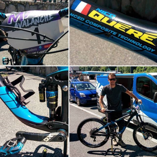 El sábado por la mañana cada uno hace su propio entreno a cuenta propia. Yo escojo hacer una bajada completa intentándola hacer del tirón para ver sensaciones y algún cambio o correción en el recorrido de última hora. Otros entrenan la sección media o la de abajo, cada cual a su gusto. Parada para reponer fuerzas con bocata y líquidos que habíamos dejado en la furgo a buen recaudo. Allí veo una furgo de Giant aparcada justo frente a la nuestra, con el rider francés Nico Quere. Charlamos un poco, muy majo el tío, entre mi pobre francés y su inglés nos vamos entendiendo.