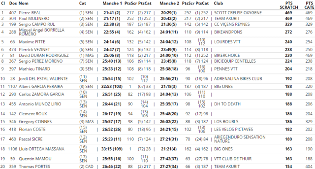 En el primer grupo, EuroCup, salen una mezcla de pros y amateurs que andan un montón, todas las categorías mezcladas. Salen como un tiro, madre mía como van, alguno se engancha pero en general hacen una salida muy rápida y limpia. Al final el Top20 scracth queda así: