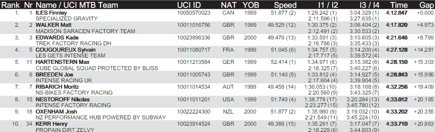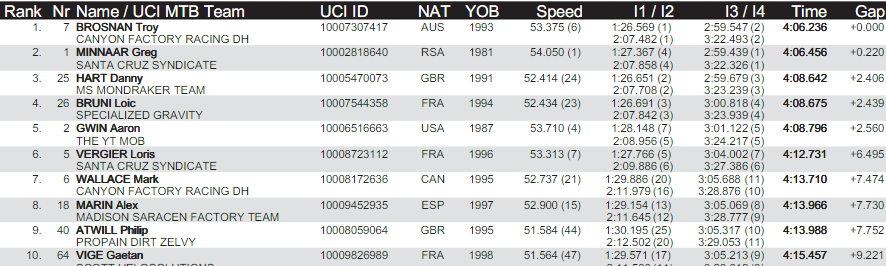 Una vez el finde se redugo a una pelea entre los grandes contendientes de los últimos años Danny Hart, Loïc Bruni, Aaron Gwin, Loris Vergier, Greg Minnaar and Troy Brosnan. Este último fue quién se llevó el premio gordo, con una bajada espectacular, ganando por escasas 220 centésimas a Greg Minnaar del Santa Cruz Syndicate y a 2.4s del vigente campeón Danny Hart de Mondraker. El francés Loic Bruni 4to y Aaron Gwin 5to.