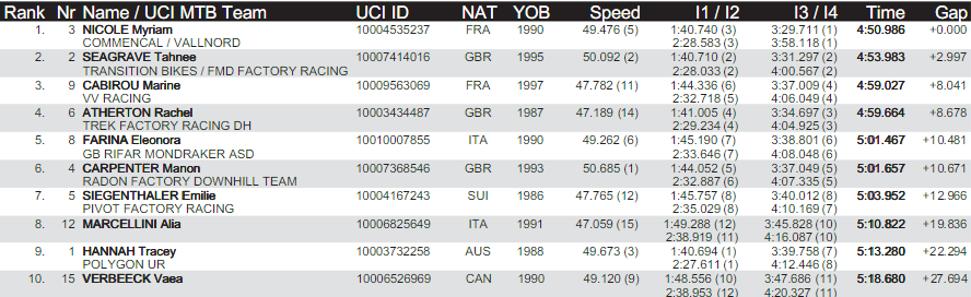 En la categoría femenina, con Rachel Atherton de Trek fuera por un hombro dislocado en Fort Williams abre la puerta a nuevas caras. Rachy logró un meritorio 4to puesto, con solo 4 semanas de recuperación, dice mucho de su espectacular estado de forma. La corredora del equipo local Commencal, Myriam Nicole, lo dio todo y ganó claramente con casi 3s de ventaja sobre la joven Tahnee Seagrave and Marine Cabirou.