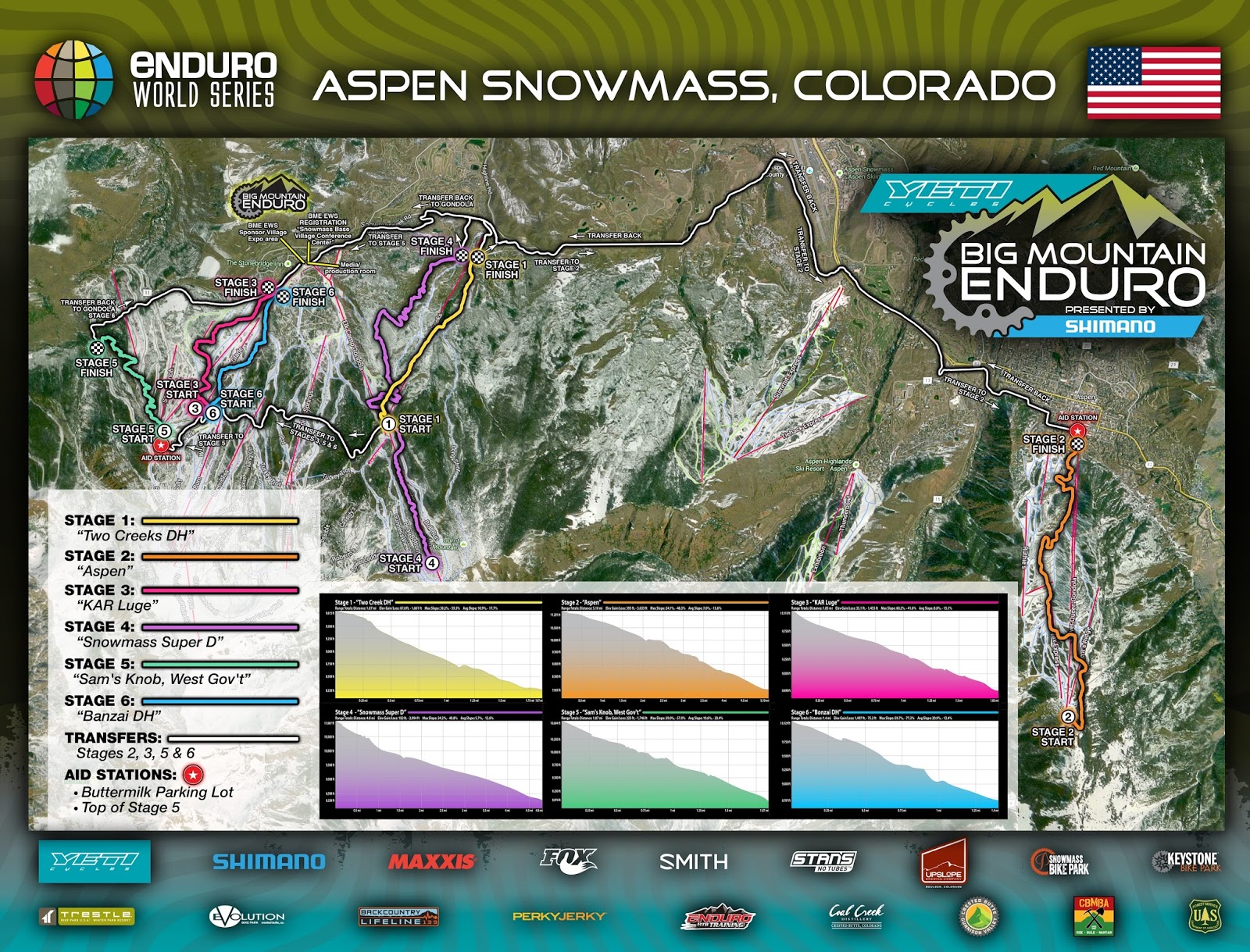 Este finde vuelve la Enduro World Series, con un carrerón en Aspen, Snowmass, Estados Unidos. Serán 2 días de carrera, con 6 tramos cronometrados, 3 cada día. De ellos 5 partirán de más de 3mil metros de altura y 2 en particular (2do y 4to) de unos 3400m de altura. El tramo más corto será el último de carrera el domingo, con 2.2km y el más largo con 8.2km será el 2do tramo del sábado.