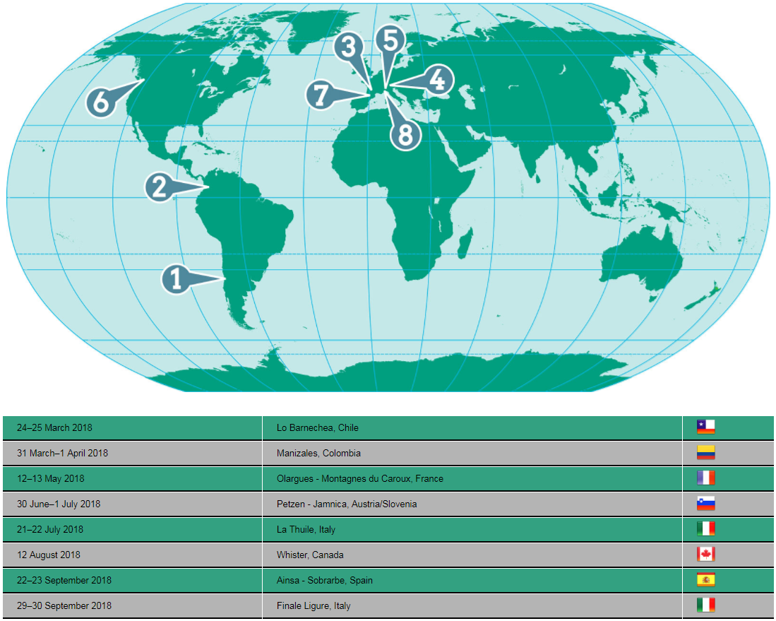 No repiten Nueva Zelanda, Tasmania ni Aspen en Colorado. Repiten La Thuile y Finale Ligure en Italia así como Whistler en Canadá. Y retoman nuevamente la sede de Ainsa en España, grandísima labor de Zona Zero BTT para lograr estar ahí arriba y darse a conocer en todo el mundo.