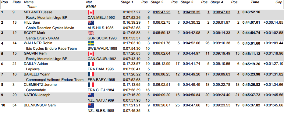 Sam Hill y el local Jesse Melamed pasaron toda la carrera separados por unos pocos segundos. Al final fue Melamed el que se llevó la victoria, siendo esta además su 1ra victoria en una ronda de la EWS y además con todos sus amigos y seguidores locales, mejor imposible. Vaya carrerón por su parte, para quitarse el sombrero.