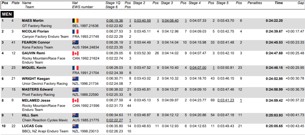 En los élites masculino, Martin Maes ganó los 3 primeros tramos, haciéndose de un buen colchón de segundos para el resto del día. Fueron Kevin Miquel, Jesse Melamed y Sam Hill quienes ganaron los tramos 4, 5 y 6 respectivamente. El francés Kevin Miquel tuvo un pinchazo en el TC5 que le sacó de lo que habría sido seguramente un podio. El corredor de DH local Connor Fearon con amplia experiencia en la Copa del Mundo de DH hizo valer sus habilidades y conocimiento del terreno para quedar 3ro detrás de Florian Nicolai. “Flying Flo” como se hace llamar, está siendo muy regular y con esta 2da posición se afianza en la general.