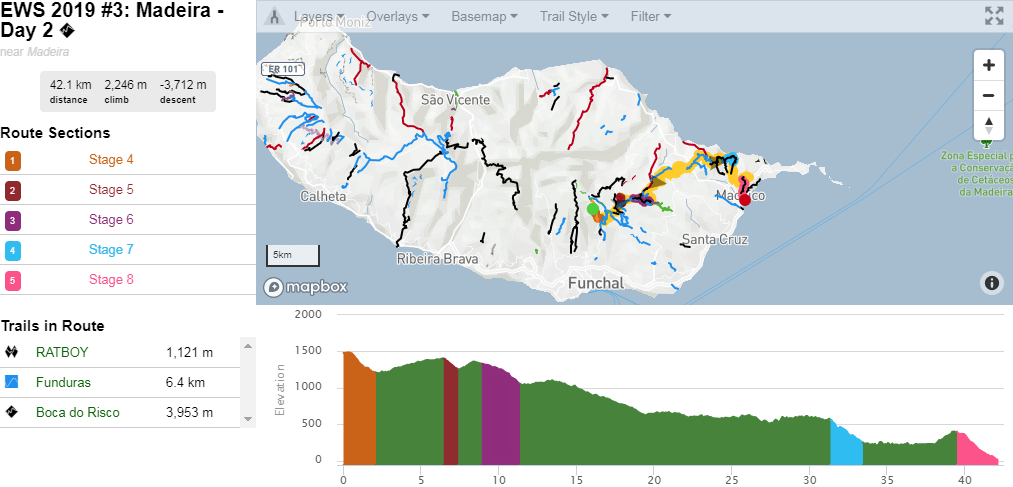 El 2do día parece que la cosa se pone seria pero los números engañan y se puede ver en el perfil más abajo. Esos 2246m de subida los harán en su gran parte en remontes, furgonetas, hasta llegar al inicio del primer tramo del día, 4to de la carrera, a 1500m de altura, en el Parque Ecológico de Funchal. Este tramo hará una parte de la famosa bajada “Gamble Line” que se abrió hace unos años para un video con Loic Bruni y otros más. El 2do tramo del día también es conocido, RatBoy, abierto para un video de Santa Cruz hace unos años en el que RatBoy tenía una papel protagonista. A continuación un enlace muy corto de subida para hacer el 3er TC del día, 6to de la carrera, “4 Estradas”.