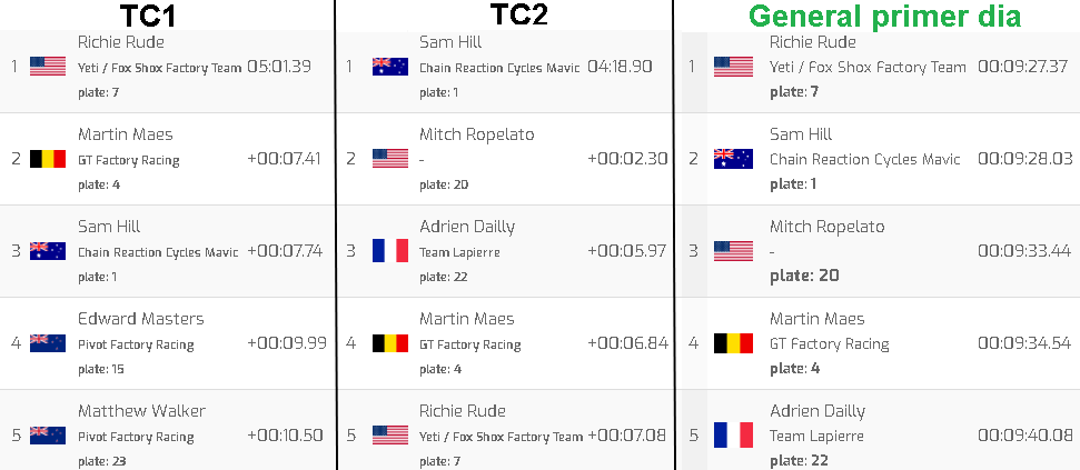 En chicas Isabeau Courdurier sigue dominando con mano de hierro y todo apunta a dominación total al final de la temporada. Ganó el TC1 con casi 10seg y el TC2 con casi 2seg. Lidera la general del día por casi 12s sobre Noga Korem que quedó 2da en ambos tramos.
