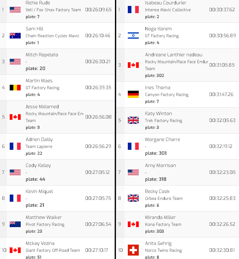 ¡Vaya carrerón! El nivel es impresionante, después de 6 tramos gana Richie Rude con un margen de menos de un seg sobre Sam Hill, escasos 81 centésimas, brutal. Tercero entró el local Mitch Ropelato a 20seg. Varios corredores habituales del top10 quedaron algo más abajo, muchos comentaban que el terreno tan polvoriento (lleva 2 meses sin llover en la zona) les afectó mucho. Martin Maes fue 4to, volviendo después de 90 días suspendido. Jesse Melamed, aún recuperándose de su lesión en la mano y el pie, quedó 5to.