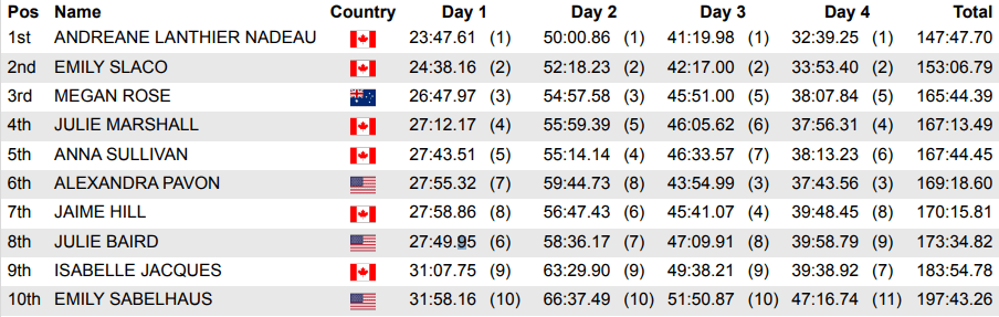 | 10th | ARIEL | LINDSLEY | 23:22.16 | (12) | 48:21.63 | (11) | 41:10.08 | (15) | 34:21.56 | (21) | 147:15.43 |