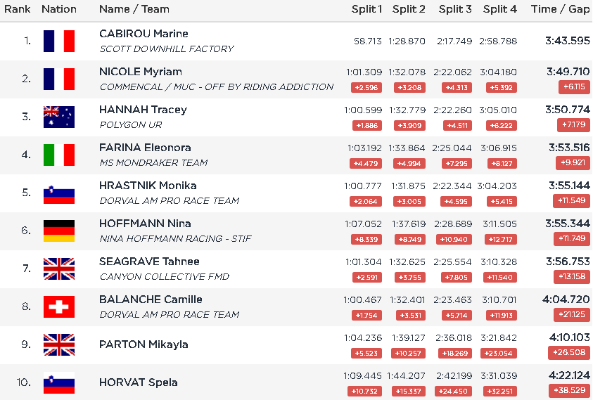 Tahnee tuvo una caída en la sección media que la dejó por completo fuera de la lucha por el podio. Camile Balanche hizo una bajada limpia pero nada rápida. Y cuando llegó el turno de Marine Cabirou, rebajó los tiempos anteriores por casi 12seg. Tras ellas quedaban pocas por bajada y ninguna logró mejorar su tiempo. La más cercanas fueron la también francesa Myriam Nicole y Tracey Hannah, la última en bajar.