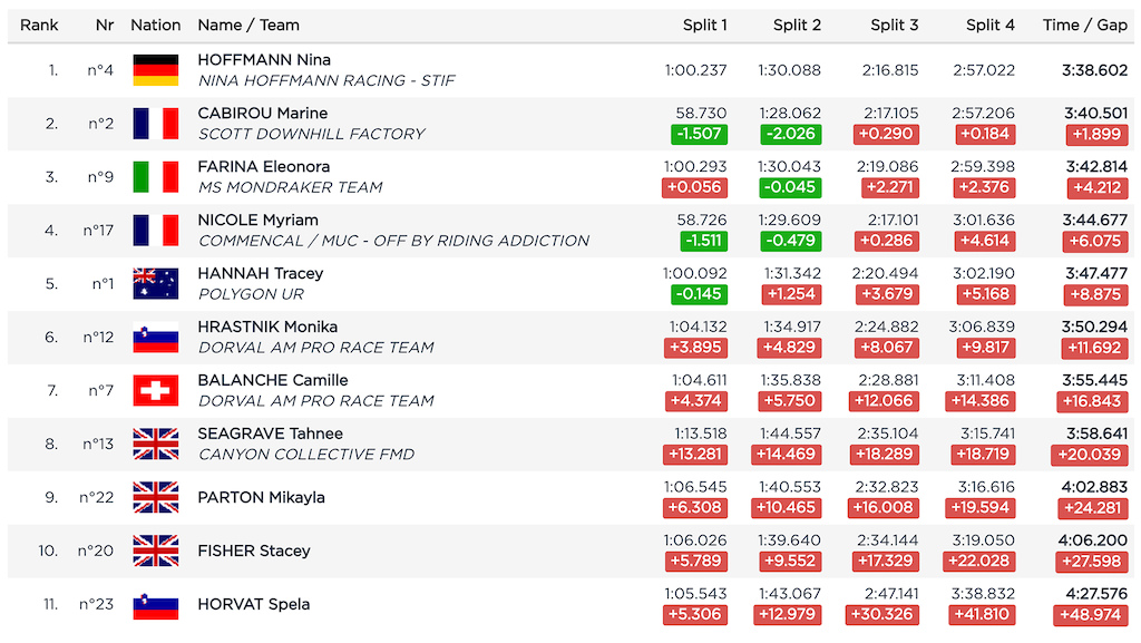 En féminas la campeona de DH alemana Nina Hoffman 4ta de la clasificación bajó haciendo un tiempo brutal, ganando sobre todo tiempo en la 2da mitad de la bajada, donde nadie pudo mejorar los tiempos que hizo ella. Pero tras ella todavía quedala Myriam Nicole iba en tiempo ganador hasta que tuvo una caída que le hizo perder valiosos segundos, luego recuperó algo pero no fue suficiente para entrar en el podio. Marine Cabirou, la ganadora del día anterior parecía que ganaría nuevamente, las 2 primeras secciones las hizo más rápida que la ganadora Nina Hoffman pero luego perdió casi 2seg para quedar 2da al final.