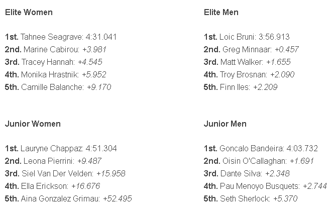 En hombres elite también se ha movido el top5 con Loic Bruni clasificando primero y Greg Minnaar ganador ayer segundo hoy en la clasificación. Matt Walker sigue fortísimo ahí arriba en tercero. Curioso ver a Loris Vergier 10mo a 3.2s de Loic ¿habrá reservado un poco a causa del pinchazo de ayer? Hay varios españoles por allí también, Angel Suarez ha quedado el 53, Iraitz Etxebarria 62, Orion Kirchmayer 65, Edgar Peyra 66 y Carlos Haro 60.