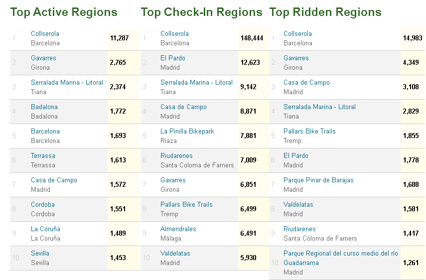 - Riding Area: corresponden con lo que normalmente cuando hablas con alguien y dices “vamos a La Pinilla” o “vamos a montar a Moncalvillo” o “A la comuna de Bunyola” o “el Pardillo”, es decir, un bikepark o el valle de una región por ejemplo. Son en general pequeñas (o no tanto) áreas que engloban una serie de senderos y es la jerarquía más pequeña