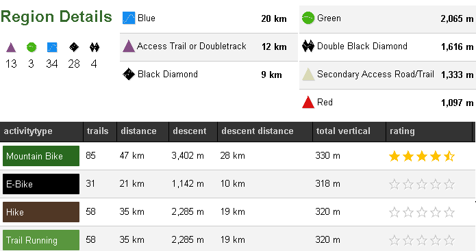 En esta captura de las estadísticas de Ticknock en Trailforks puedes ver claramente lo que comentaba antes. Tienes 20km de senderos azules repartidos en 34 senderos, 12km de pista de acceso en 13 secciones, 9km de senderos negros y solo 1616m de sendero doble rombo negro y 1097m de unos pocos rojos muy cortos. Aquí están mezclados los senderos oficiales del trail center y los naturales. En senderos oficiales en total hay unos 20km.