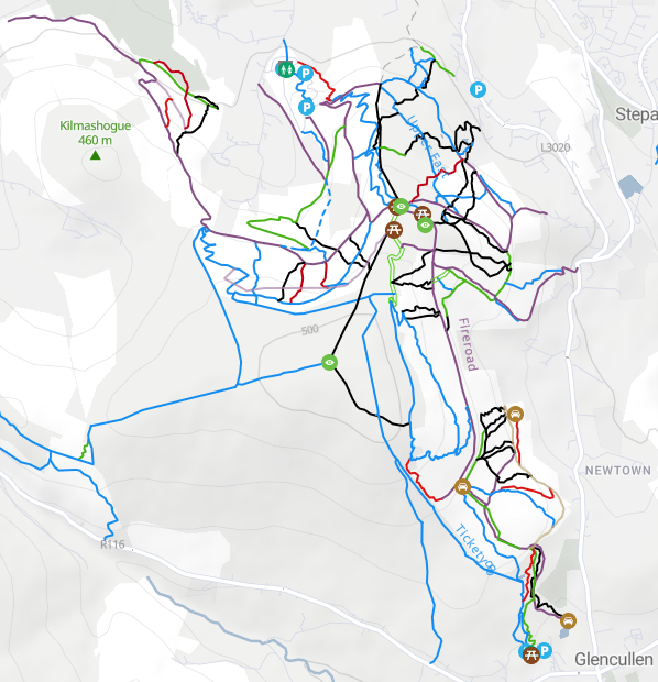 Desde que llegué hace par de años a Irlanda (el tiempo vuela!) descubrí otra manera de ver los centros BTT o “trail centers” como se les llama en Irlanda, Gran Bretaña y en general en los países anglosajones. Suelen ser áreas en general más pequeñas que lo que engloba un centro BTT típico en España, una pequeña colina o montaña de no mucha altitud. Coexisten los senderos “oficiales” del trail center con los senderos naturales de toda la vida. Estos senderos oficiales son los que marcan la diferencia con los centro BTT de España pues son senderos construidos específicamente para ir en bici (metiendo maquinaria incluso) y son señalizados como tal para evitar conflictos con los senderistas y caballos si los hubiera. Son además senderos pensados y estudiados para que sean sostenibles, que el agua no los destroce, muchos con canalización incluso, rompeaguas y tal, cuidando y a la vez aprovechando el terreno por el que transcurre, intentando aprovechar al máximo las características del mismo.