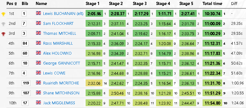 En el apartado masculino en élite Lewis Buchanan ganó todos los tramos sacándole casi 30s al segundo. Pero en la general quedó 4to ya que 3 corredores sub23 lograron quedar por delante.