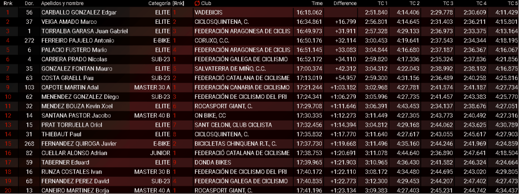 En el apartado masculino el canario Edgar Carballo dominó la carrera de principio a fin ganando todos los tramos con un tiempo final de 16:18.062. Le siguieron de cerca Marco Veiga Amado 16:34.861 que quedó 2do en 4 de los 5 tramos y Gabriel Torralba con 16:49.973. Me llamó la atención en el 2do tramo que Gabriel Torralba, entrara en el puesto 13 ya que esperaba verle codo a codo luchando por el podio con Edgar Carballo, Nicolas Carrera y demás contendientes por el top5 de la general. Según una publicación de él mismo luego en su Instagram, tuvo un percance mecánico en ese tramo que le hizo perder varios segundos preciosos. En sub23 Pau Costa arrancó ganando el TC1 pero luego el gallego Nicolás Carrera confirmó que es una figura a tener en cuenta y ganó los siguientes 4 tramos quedando 5to de la general, y ganador de su categoría.